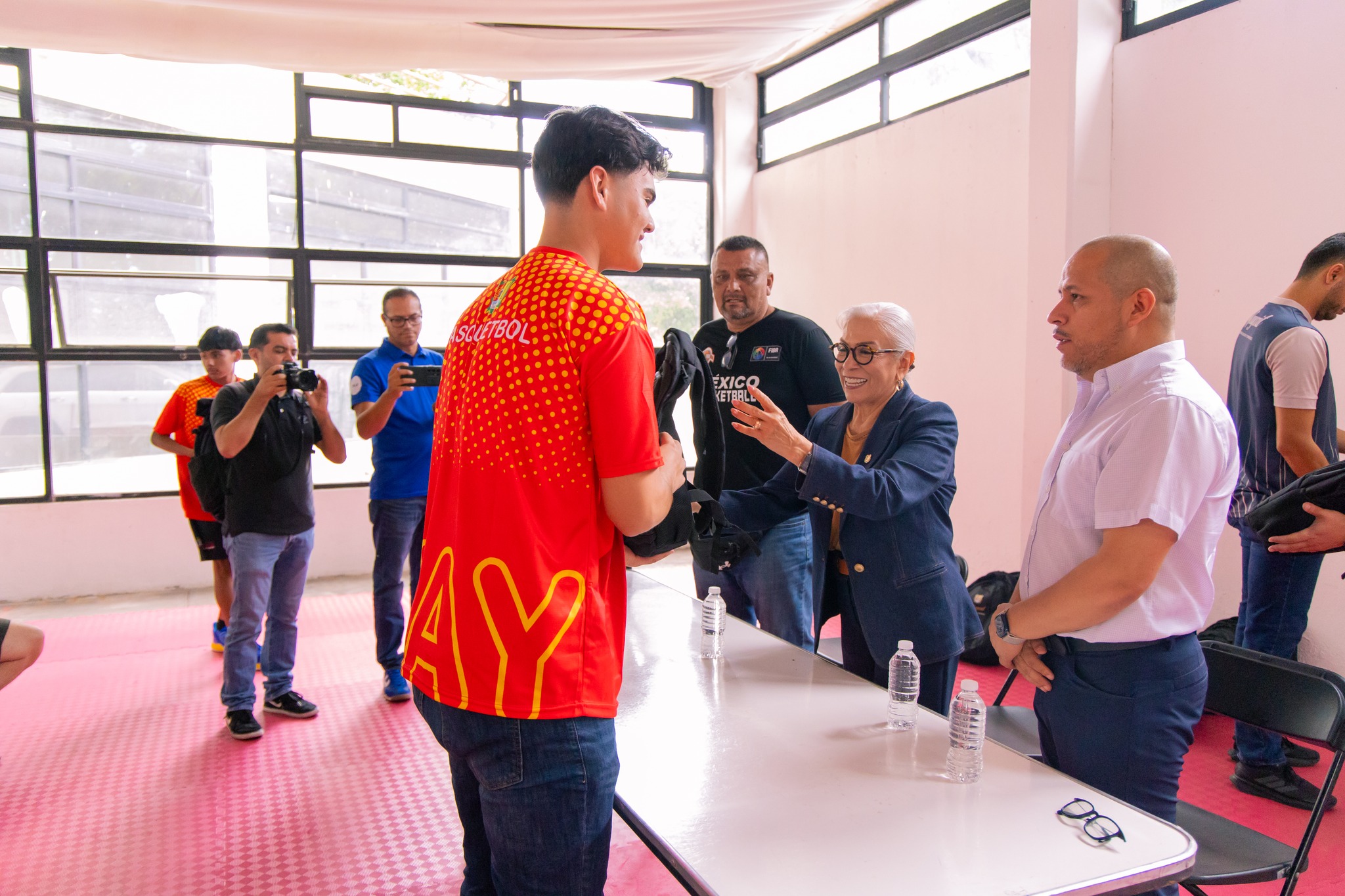 La presidenta del Sistema DIF Nayarit, doctora Beatriz Estrada Martínez, en representación de su esposo, el gobernador del estado Miguel Ángel Navarro Quintero, entregó uniformes a la selección U15 de Nayarit que participará en el Campeonato Nacional ADEMEBA Sub-15, encuentro que dará inicio esta noche en el Gimnasio Niños Héroes de Tepic y que llena de orgullo a todo el estado.